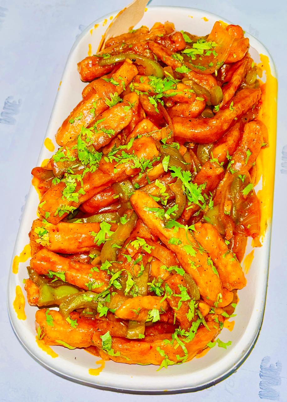 Crispy fried potatoes tossed in a spicy garlic-chili sauce with capsicum and onions – a bold and flavorful Indo-Chinese treat.
