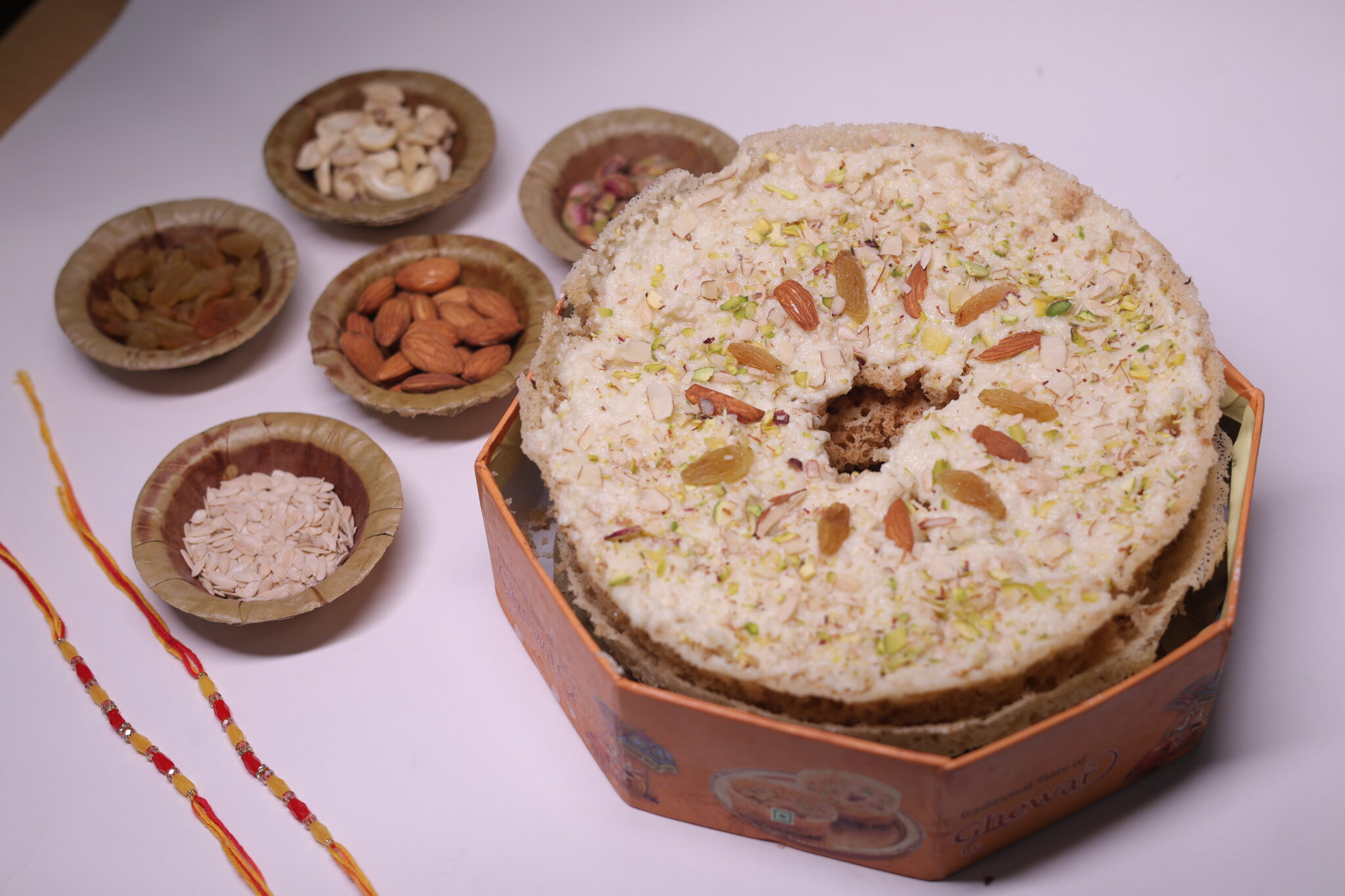 Crispy ghewar topped with creamy mawa and premium dry fruits – a traditional Rajasthani sweet made for celebrations.